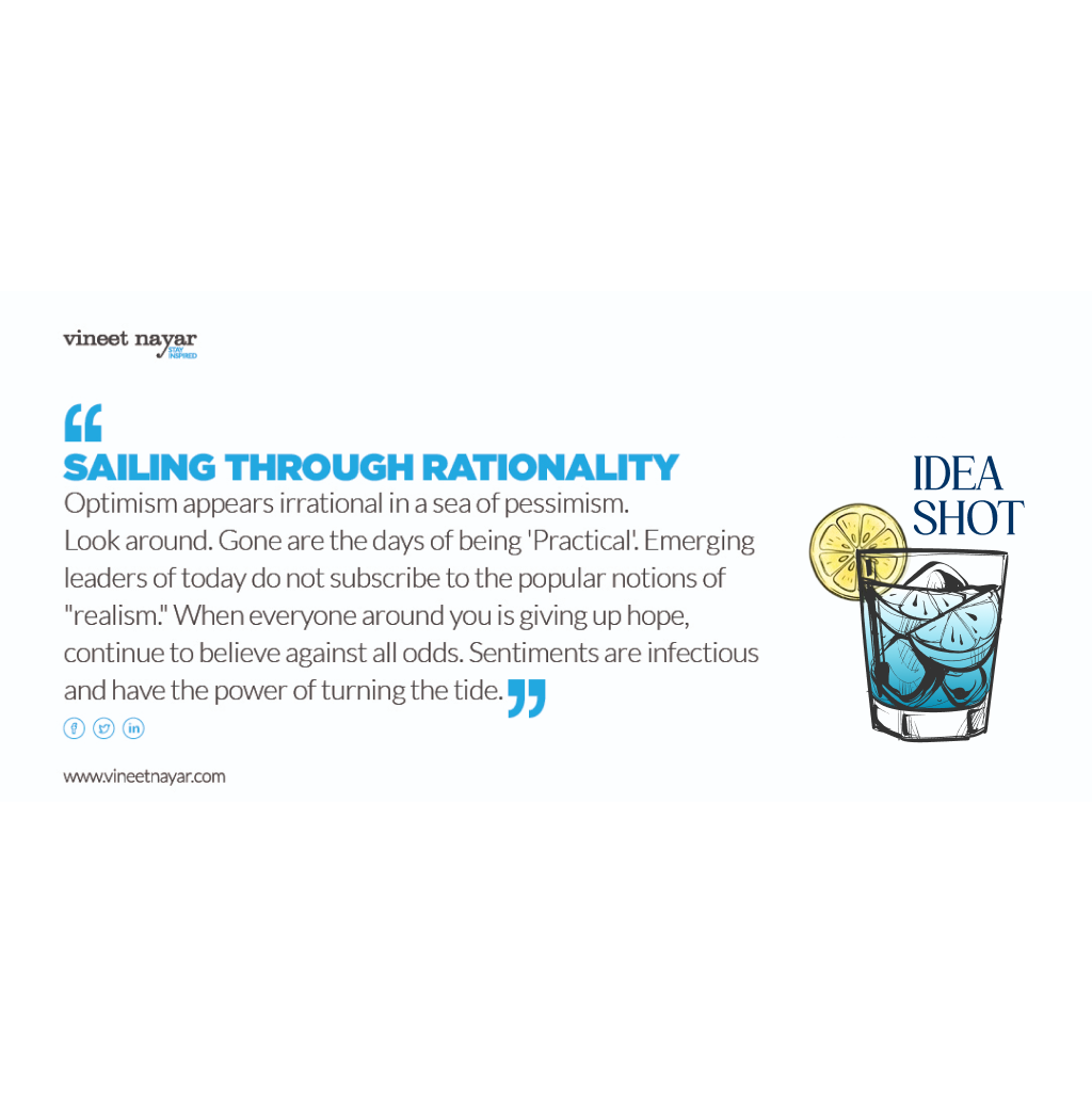 Look around. Gone are the days of being ‘Practical’. Emerging leaders of today do not subscribe to the popular notions of “realism.” When everyone around you is giving up hope, continue to believe against all odds. Sentiments are infectious and have the power of turning the tide.
