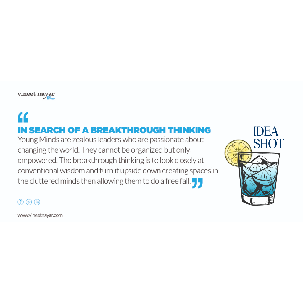 Young Minds are zealous leaders who are passionate about changing the world. They cannot be organized but only empowered. The breakthrough thinking is to look closely at conventional wisdom and turn it upside down creating spaces in the cluttered minds then allowing them to do a free fall.